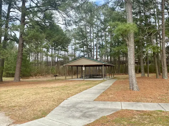 The park features a covered picnic shelter with picnic tables and a grill. It is a great spot for birthday parties, family get-togethers, and casual outdoor meals. The park includes a playground area with swings, climbing apparatus, and a large playhouse with slides, providing engaging play opportunities for children of various ages.